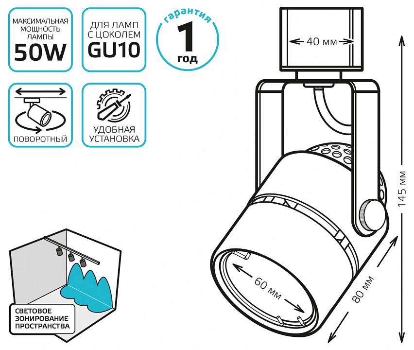 - Дополнительные параметры поворотный светильник, однофазная система