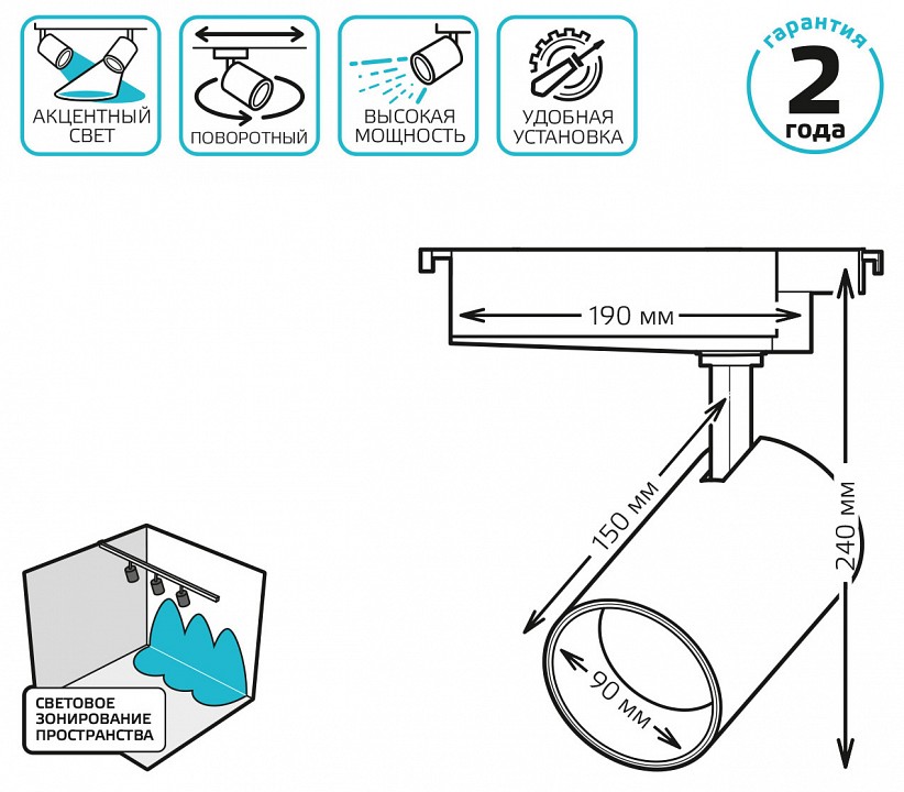 - Дополнительные параметры поворотный светильник, однофазная система